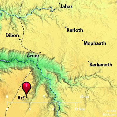 Atlas ![]() Ar and surrounding area Maps Created using Biblemapper 3.0 Additional data from OpenBible.info You are free to use up to 50 Biblos coprighted maps (small or large) for your website or presentation. Please credit Biblos.com. Occurrences Numbers 21:15 the slope of the valleys that incline toward the dwelling of Ar, leans on the border of Moab."Numbers 21:28 for a fire has gone out of Heshbon, a flame from the city of Sihon. It has devoured Ar of Moab, The lords of the high places of the Arnon. Deuteronomy 2:9 Yahweh said to me, "Don't bother Moab, neither contend with them in battle; for I will not give you of his land for a possession; because I have given Ar to the children of Lot for a possession." Deuteronomy 2:18 "You are this day to pass over Ar, the border of Moab: Deuteronomy 2:29 as the children of Esau who dwell in Seir, and the Moabites who dwell in Ar, did to me; until I shall pass over the Jordan into the land which Yahweh our God gives us." Isaiah 15:1 The burden of Moab: for in a night, Ar of Moab is laid waste, and brought to nothing; for in a night Kir of Moab is laid waste, and brought to nothing. Encyclopedia AR, AR OF MOABar, mo'-ab (`ar, `ar-mo'abh; Er; Aroer or See ir): The city of Ar is named in a snatch of ancient song (Numbers 21:15), literally "the site of Ar." It is identical with "Ar of Moab" (Numbers 21:28 Isaiah 15:1). This is probably the place called the City of Moab in Numbers 22:36, where the Hebrew is `ir mo'abh. It is probably also intended by "the city that is in the middle of the valley" (Deuteronomy 2:36 Joshua 13:9, 16 2 Samuel 24:5). It lay "on the border of the Arnon, which is in the utmost part of the border" (Numbers 22:36). A possible identification might be the ruin noted by Burckhardt, in the floor of the valley, on a piece of pasture-land below the confluence of the Lejjun and the Mojib. Buhl however thinks that not a city but a Moabite district somewhere in the region south of the Arnon may be intended (GAP, 269). AR, or AR of MOAB, it was probably the same as Aroer e. of the Dead sea and not to be confounded with Rabbah, as some have done. Its site is not certainly known. RABBATH-MOAB, see Ar. Strong's Hebrew H6144: Ara place in Moab |