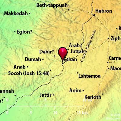 Atlas ![]() Eshan and surrounding area Maps Created using Biblemapper 3.0 Additional data from OpenBible.info You are free to use up to 50 Biblos coprighted maps (small or large) for your website or presentation. Please credit Biblos.com. Occurrences Joshua 15:52 Arab, Dumah, Eshan,Encyclopedia ESHANe'-shan ('esh`an; Esan; the King James Version Eshean): Strong's Hebrew H824: Eshan"support," a place in Judah |