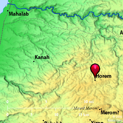 Atlas ![]() Horem and surrounding area Maps Created using Biblemapper 3.0 Additional data from OpenBible.info You are free to use up to 50 Biblos coprighted maps (small or large) for your website or presentation. Please credit Biblos.com. Occurrences Joshua 19:38 Iron, Migdal El, Horem, Beth Anath, and Beth Shemesh; nineteen cities with their villages.Encyclopedia HOREMho'-rem (chorem, "consecrated"): One of the fenced cities in the territory of Naphtali (Joshua 19:38), named with Iron and Migdal-el. It may possibly be identified with the modern Hurah, which lies on a mound at the South end of Wady el-`Ain, to the West of Qedes. Strong's Hebrew H2765: Chorem"sacred," a place in Naphtali |