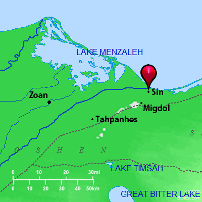 From Marah, the next march led to Elim ("the palms"), where were "twelve springs (not "wells") of water and seventy palms." The site seems clearly to have been in Wady Gharandil, where a brook is found fed by springs of better water than that of Marah. The distance is only about 6 miles, or an easy march, and palm trees exist near the waters. Israel then entered the desert of Sin, stretching from Elim to Sinai, reaching a camp "by the Red Sea" (Numbers 33:10) just a month after leaving Egypt (Exodus 16:1). The probable site is near the mouth of Wady et-Taiyibeh ("the goodly valley"), which is some 10 or 12 miles from the springs of Gharandil. The foothills here project close to the coast, and North of the valley is Jebel Chammam Far'aun ("the mountain of Pharaoh's hot bath"), named from hot sulphur springs. The water in Wady et-Taiyibeh is said to be better than that of Marah, and this is the main Arab watering-place after passing Gharandil. A small pond is here described by Burckhardt at el-Murkhat, in the sandstone rock near the foot of the mountains, but the water is bitter and full of weeds, moss and mud. The site is close to a broad shore plain stretching South Here two roads diverge toward Sinai, which lies about 65 miles to the Southeast, and in this interval (Numbers 33:11-15) five stations are named, giving a daily march of 13 miles. The Hebrews probably took the lower and easier road, especially as it avoided the Egyptian mines of Wady el-Maghdrah ("valley of the cave") and their station at Serabit el-Khadim ("pillars of the servant"), where-though this is not certain-there may have been a detachment of bowmen guarding the mines.