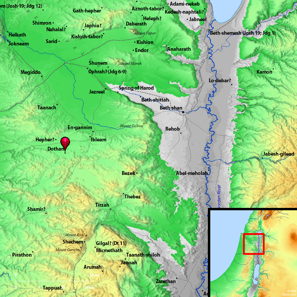 Atlas ![]() Dothan and surrounding region Maps Created using Biblemapper 3.0 Additional data from OpenBible.info You are free to use up to 50 Biblos coprighted maps (small or large) for your website or presentation. Please credit Biblos.com. Occurrences Genesis 37:17 The man said, "They have left here, for I heard them say,'Let us go to Dothan.'" Joseph went after his brothers, and found them in Dothan.Genesis 37:25 They sat down to eat bread, and they lifted up their eyes and looked, and saw a caravan of Ishmaelites was coming from Gilead, with their camels bearing spices and balm and myrrh, going to carry it down to Egypt. 2 Kings 6:13 He said, "Go and see where he is, that I may send and get him." It was told him, saying, "Behold, he is in Dothan." Encyclopedia DOTHANdo'-than (dothayin, dothan, "two wells," "double feast"; Dothaeim): A place to the North of Shechem whither Jacob's sons went for pasture for the flocks; where Joseph who followed them was sold to the Ishmaelites, after having been imprisoned in a "pit" (Genesis 37:17). Here in later days the eyes of Elisha's servant were opened to see the mountain "full of horses and chariots of fire," guarding his master from the encircling Syrians (2 Kings 6:13). This is certainly to be identified with Tell Dothan, which lies on the East of the ancient road leading from Gilead across Esdraelon to the seacoast, and thence to Egypt. It is about 5 miles to the Southwest of Jenin. There are some traces of old buildings, two cisterns-Dothayin or Dothayin = "two cisterns" or "pits"-and one copious spring. Excellent pasture is found in the surrounding plain, and on the adjoining slopes. DOTHAN, now tell Dothan, 42 ms. n. of Jerusalem, 5 ms. s.w. of Jenin on the s. of a beautiful plain but with only a few ruins on a hill. Strong's Hebrew H1886: Dothana place North of Samaria |