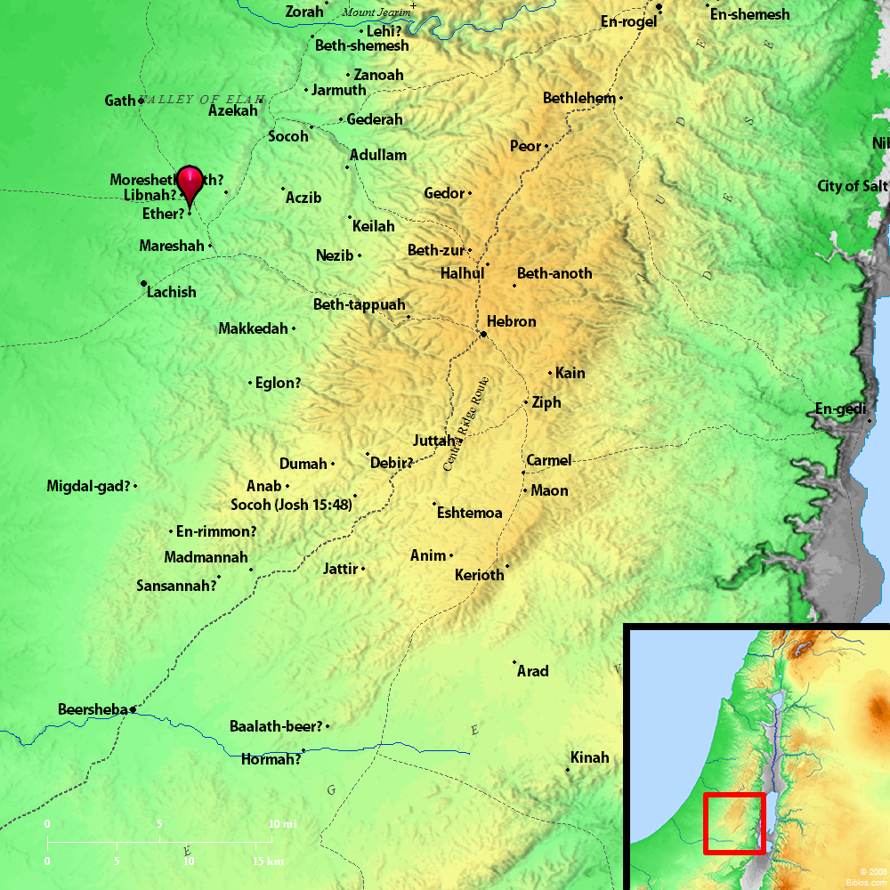 Atlas ![]() Ether and surrounding region Maps Created using Biblemapper 3.0 Additional data from OpenBible.info You are free to use up to 50 Biblos coprighted maps (small or large) for your website or presentation. Please credit Biblos.com. Occurrences Joshua 15:42 Libnah, Ether, Ashan,Joshua 19:7 Ain, Rimmon, Ether, and Ashan; four cities with their villages; Encyclopedia ETHERe'-ther (`ether; Ather): Strong's Hebrew H6281: Etherperhaps "abundance," a place in Judah |