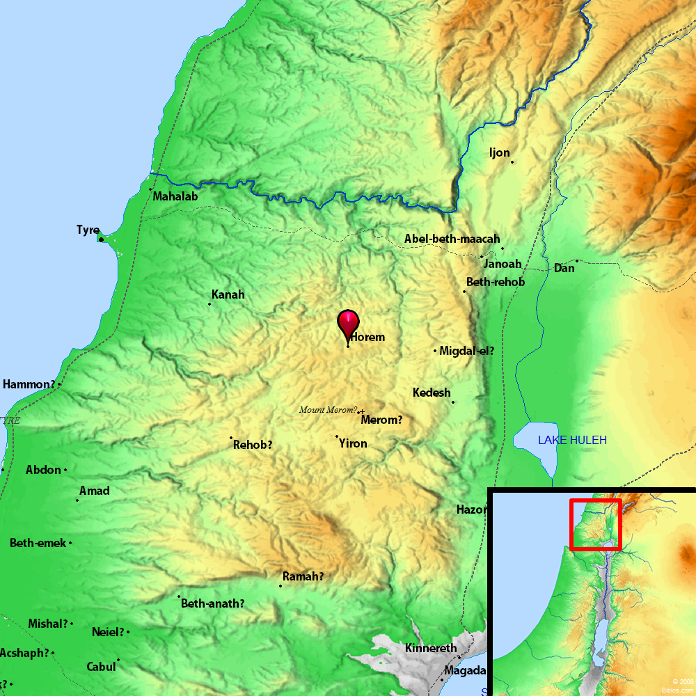 ho'-rem (chorem, "consecrated"): One of the fenced cities in the territory of Naphtali (Joshua 19:38), named with Iron and Migdal-el. It may possibly be identified with the modern Hurah, which lies on a mound at the South end of Wady el-`Ain, to the West of Qedes.