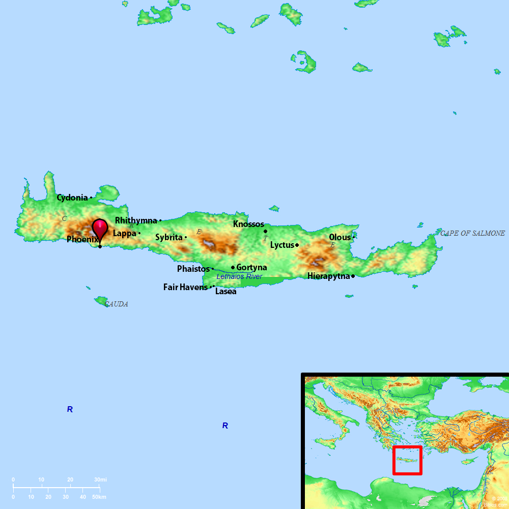 The writer of Acts never saw Phoenix, which must have been a good harbor, as the nautical experts decided to winter there (Acts 27:11). Now the only safe harbor on the South coast of Crete in which a ship large enough to carry a cargo of corn and 268 souls could moor is the harbor beside Loutro, a village on the South coast of Crete, directly North of Cauda. All the ancient authorities agree in placing Phoenix in this neighborhood. The harbor at Loutro affords shelter from all winds, and its identification with Phoenix seems certain. But a serious difficulty arises on this view. The words describing the harbor of Phoenix ordinarily mean "looking toward the Southwest and the Northwest," but the harbor beside Loutro looks eastward. This led Bishop Wordsworth to identify Phoenix with an open roadstead on the western side of the isthmus on which Loutro stands. But this roadstead is not a suitable place for wintering in, and it is better either to take the words to mean, in sailor's language, "looking down the Southwest and Northwest winds"-a description which exactly fits the harbor at Loutro-or to assume that the reporter of the discussion referred to in Acts 27:10-12 or the writer of Acts made a mistake in describing a place which he had never seen. An inscription belonging to the reign of Trajan found at Loutro shows that Egyptian corn ships were wont to lie up there for the winter.